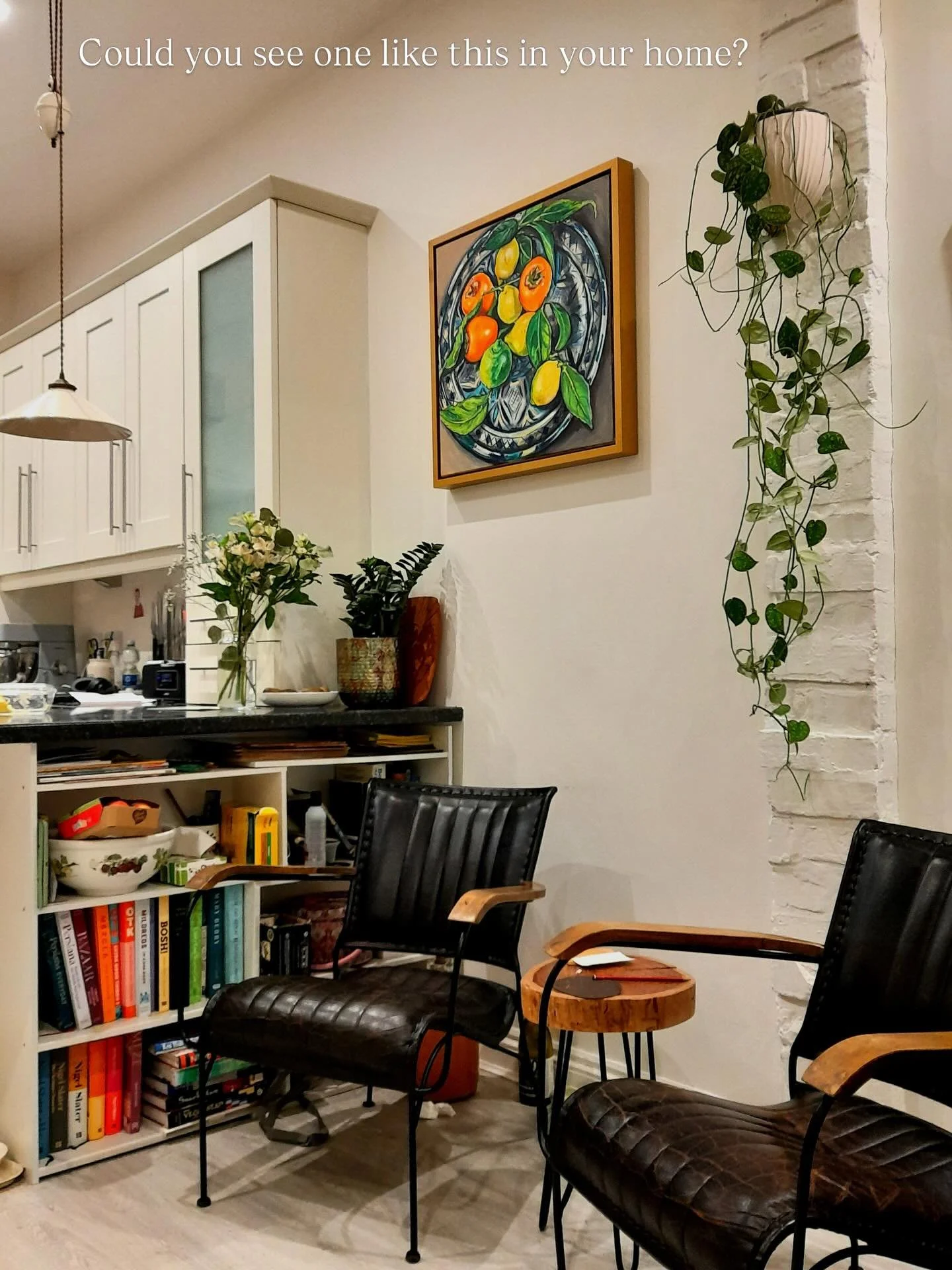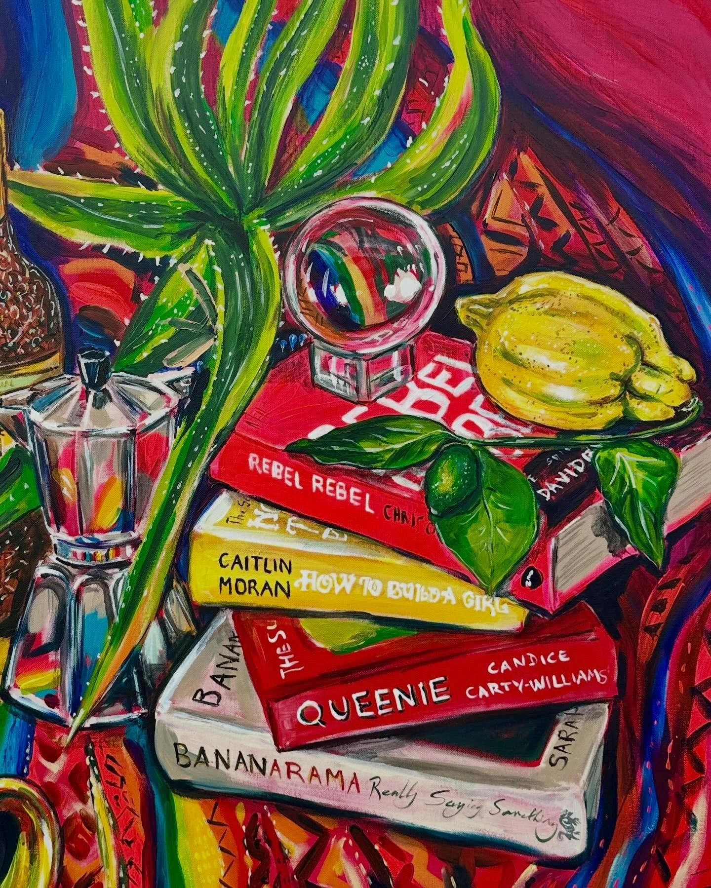 Lucyโs paintings stimulate the senses on all levels - Food and drink and the sensual experience are recurring themes in her painting. All the senses sight, touch, taste, smell and sound come into her work in various forms: the bright yellow of urgent lemons, the texture of skin, peel and fur; the feel of traditional woven fabrics collected from travels, deliriously heady cocktails, fascinating books and much-loved vinyl records. Find out more in her own words by clicking on the her photo above.
