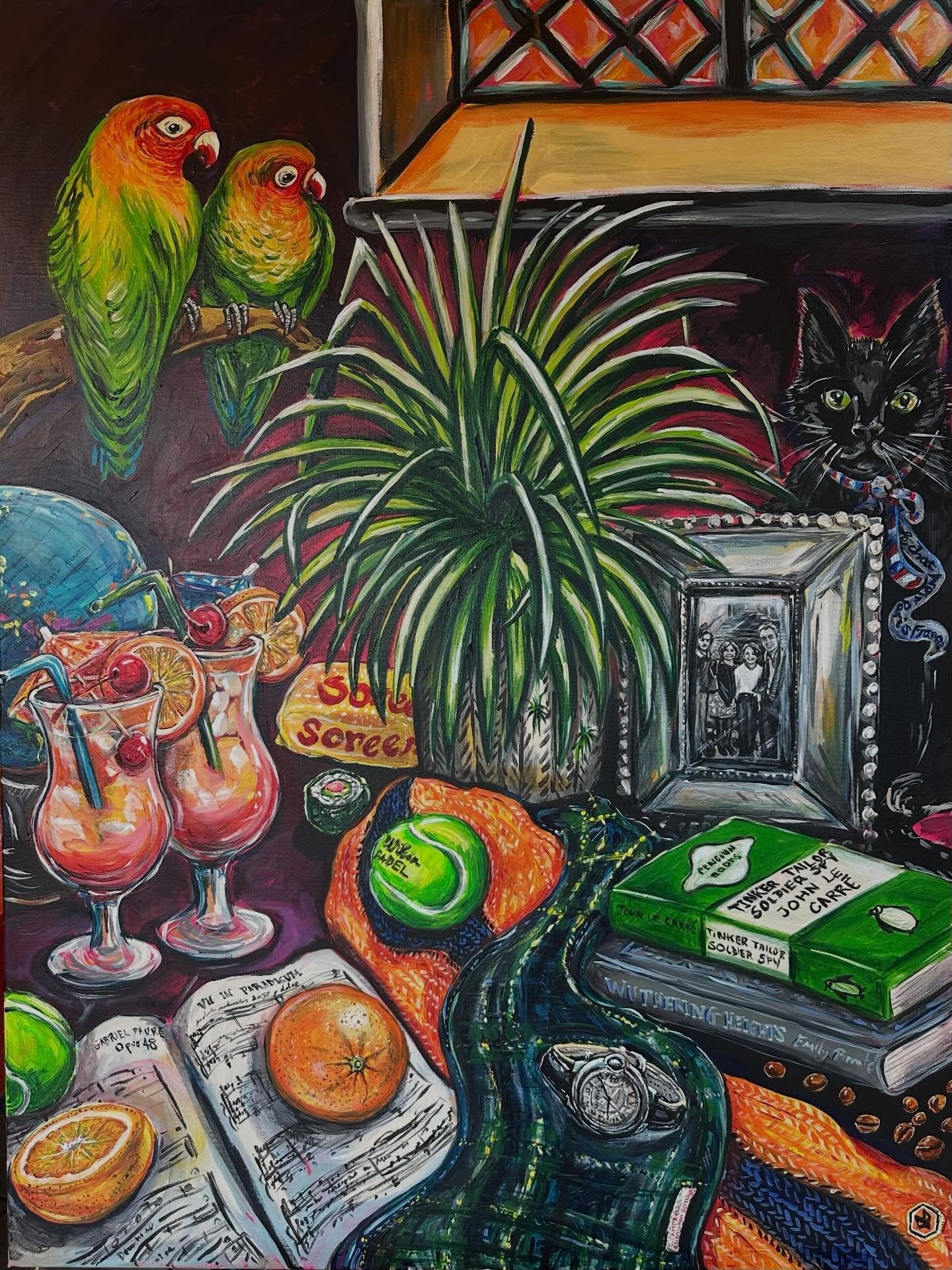 Lucy’s paintings stimulate the senses on all levels - Food and drink and the sensual experience are recurring themes in her painting. All the senses sight, touch, taste, smell and sound come into her work in various forms: the bright yellow of urgent lemons, the texture of skin, peel and fur; the feel of traditional woven fabrics collected from travels, deliriously heady cocktails, fascinating books and much-loved vinyl records. Find out more in her own words by clicking on the her photo above.